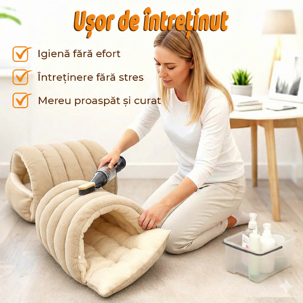 Fabricat din material pufos, moale si rezistent, culcusul ofera confort superior, iar perna detasabila inclusa asigura un plus de sustinere si faciliteaza curatarea rapida. Este ideal pentru utilizare in interior – in living, dormitor, balcon inchis sau spatiul dedicat animalutului tau.